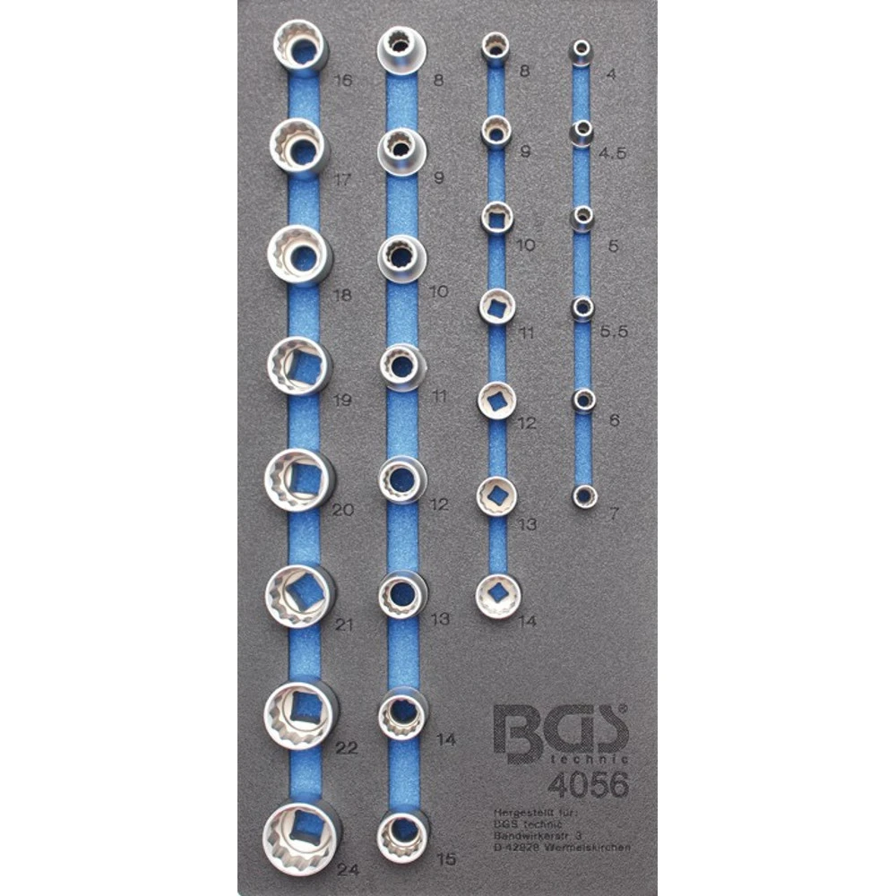BGS Werkstattwageneinlage 189 x 408x 32 mm, Größe 1/3 mit 29 Schlüssel-Einsätzen für 1/4″ und 1/2″