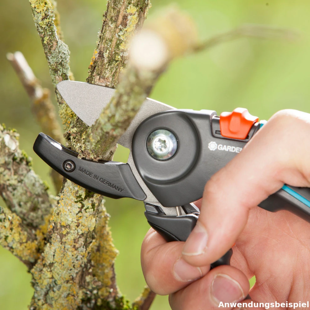 Die GARDENA Gartenschere A/M mit antihaftbeschichteter Oberklinge ist zum komfortablen Schneiden von älteren, Ă„sten und Zweigen bestimmt. Die ergonomisch ausgeformten Griffe mit eingearbeiteten Weichkomponenten passen perfekt in die Hand. Die Feder ist in die Schere einmontiert und somit verliersicher und vor Verschmutzung geschĂĽtzt. Dank des Einhand-Sicherheitsverschlusses kann die Schere einfach geschlossen und sicher aufbewahrt werden. Diese Amboss-Gartenschere kann einen maximalen Astdurchmesser von 23 mm schneiden. Die 25-jährige Garantie sorgt fĂĽr höchste Qualität “Made in Germany”.