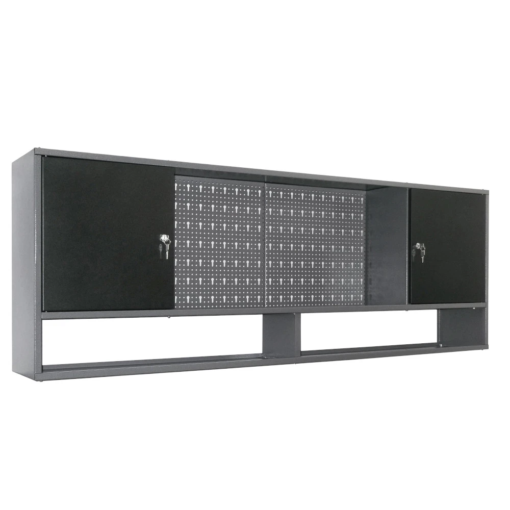 Werkzeug-Wandschrank 4-teilig aus Metall fĂŒr alle, die ihre Werkzeuge in einer guten Ordnung halten wollen. Der Wandschrank ist gerĂ€umig und leicht an der Wand zu montieren. Der Werkzeugschrank besteht aus 4 Elementen – zwei verschlieĂbare Teile und zwei offene Mittelteile mit Lochwand. Die Mittelteile sind mit zwei Metall-Regalböden ausgestattet, die in der Höhe variabel montierbar sind. An der Unterseite befindet sich eine Ablage fĂŒr SichtlagerkĂ€sten.