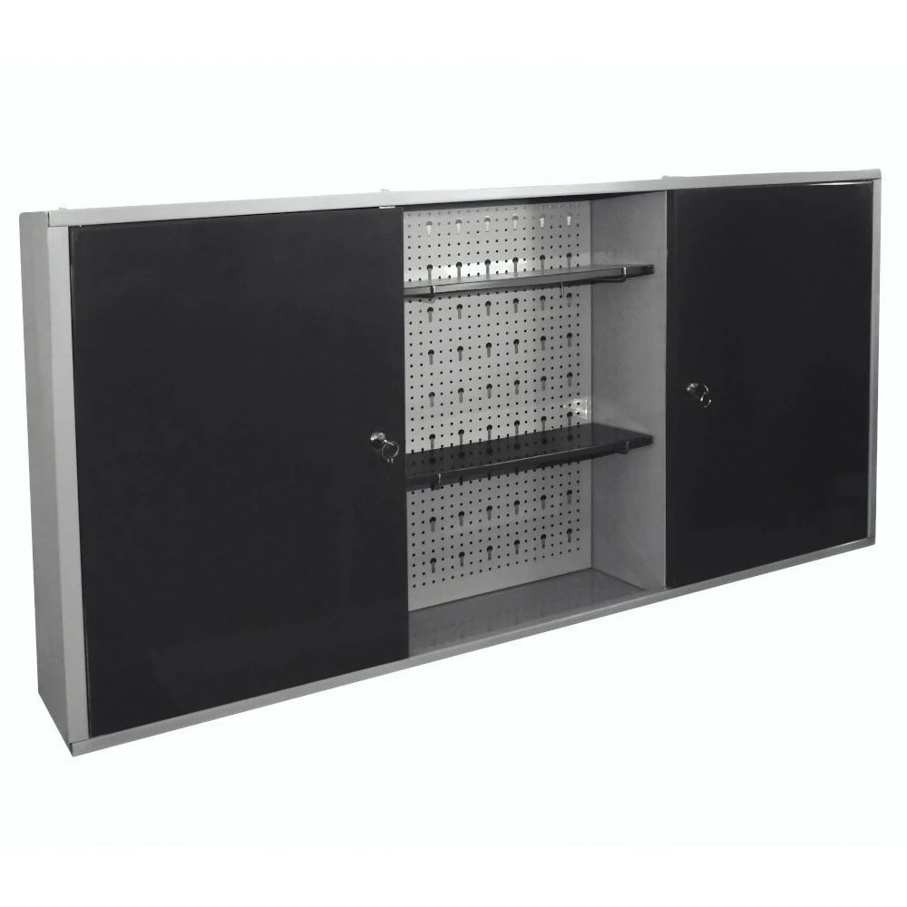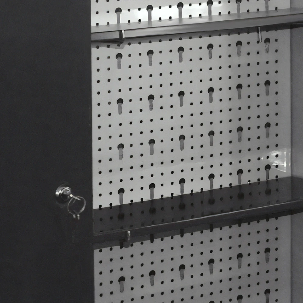 DoppeltĂĽriger Werkzeug-Wandschrank aus Metall fĂĽr alle, die ihre Werkzeuge in einer guten Ordnung halten wollen. Der Wandschrank ist geräumig und leicht an der Wand zu montieren. Der Werkzeugschrank besteht aus 3 Elementen – zwei verschlieĂźbare Teile und ein offenes Mittelteil mit Lochwand. Das Mittelteil ist mit zwei Metall-Regalböden ausgestattet, die in der Höhe variabel montierbar sind.