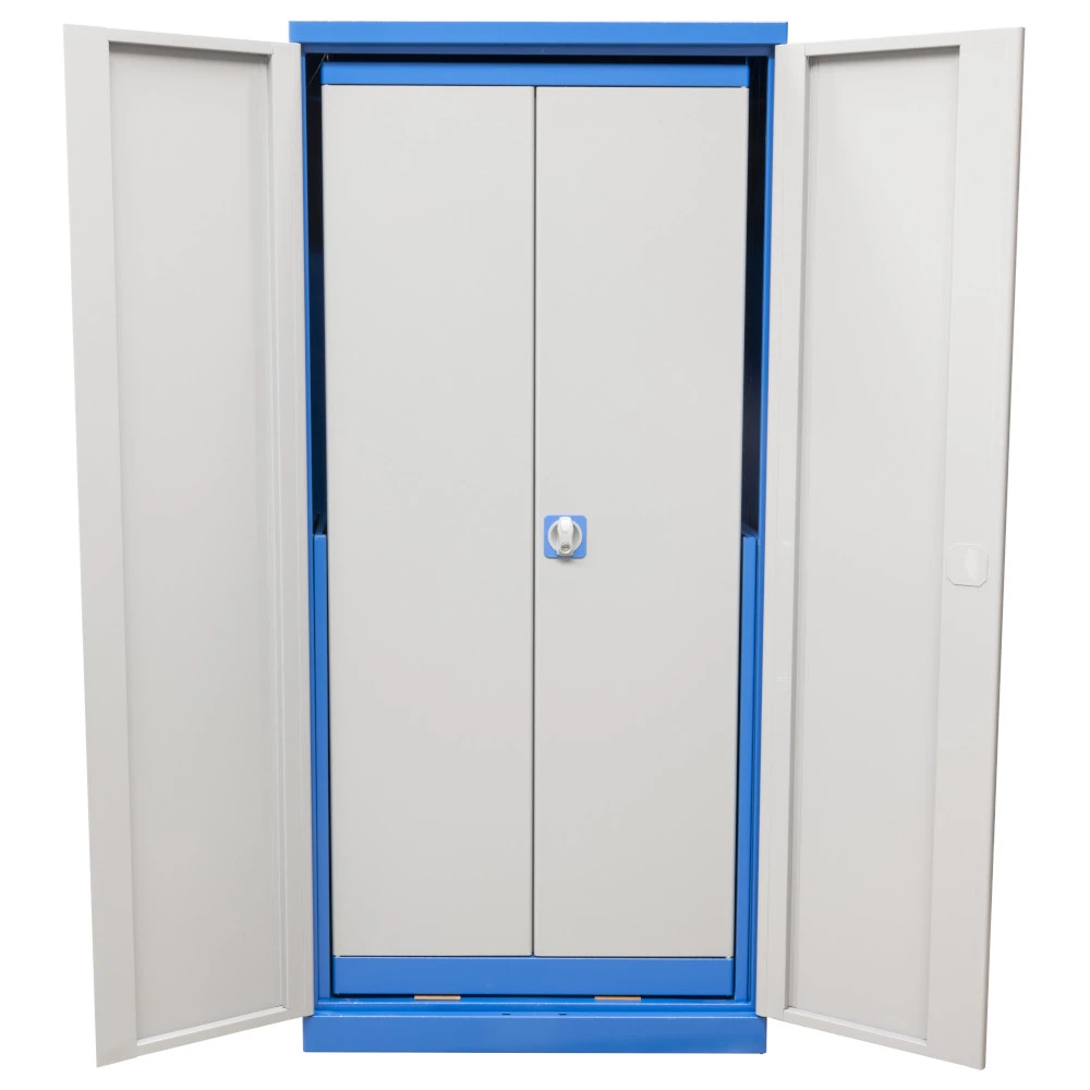 Das GÜDE Werkstattschrank-Set sorgt für Ordnung in der Werkstatt, Büro oder Archiv. Ausgestattet sind die Metallschränke mit je 2 Flügeltüren und je 4 Fachböden. Die Flügeltürenschränke sind zwei-farbig, in blau und grau, pulverbeschichtet. Mittels Doppelriegel mit Zylinderschloss werden Akten, Werkzeug und andere Utensielien sicher verstaut.