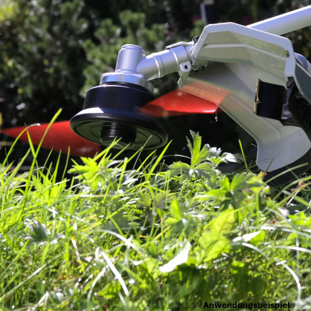 Zusätzlich hast du einen 3-Zahn-Dickichtmesser sowie eine Fadenspule mit Doppelfaden (2×20 m) und Tippautomatik für die Rasenfläche- oder Rasenkantenpflegen.