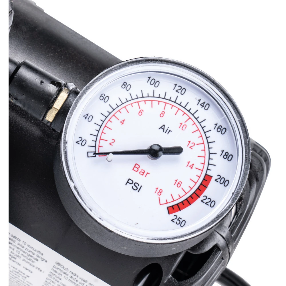 Der mobile Luftkompressor Dunlop ist mit seinen 12 V eine praktische Hilfe zum Aufblasen oder auch Ablassen von Gästebetten, Luftmatratzen, Fahrradreifen und vieles Mehr. Einfach den Adapter in den PKW-Zigarettenanzünder stecken und schon kann es losgehen. Zusätzlich ist der Kompressor ist mit einem Manometer ausgestattet, das den Druck sowohl in PSI als auch in bar anzeigt (max. 250 PSI/ 17 bar). Im Lieferumfang sind drei Aufsätze, in verschiedenen Größen, ein Adapter für den PKW-Zigarettenanzünder und ein 2,85 m langes Kabel enthalten.