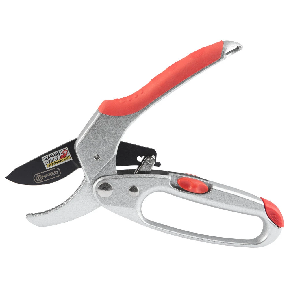 Die Ratschen-Gartenschere eignet sich zum effektiven Schneiden von stĂ€rkeren Ăsten, Zweigen mit gröĂerem Durchmesser und frischem Holz. Ausgestattet mit einer antihaftbeschichteten Klinge aus Carbon-Stahl bietet diese Schere beste Schnittergebnisse. Somit ist es möglich Ăste mit deinem Durchmesser von bis zu 10 mm zu durchtrennen. Die ergonomisch ausgeformten Griffe mit eingearbeiteten Weichkomponenten sorgen fĂŒr Komfort und die nötige Rutschfestigkeit. Dank des Einhand-Sicherheitsverschlusses kann die Astschere einfach geschlossen und sicher aufbewahrt werden. ZusĂ€tzlich lassen sich verbrauchte Klingen schnell und einfach auswechseln.