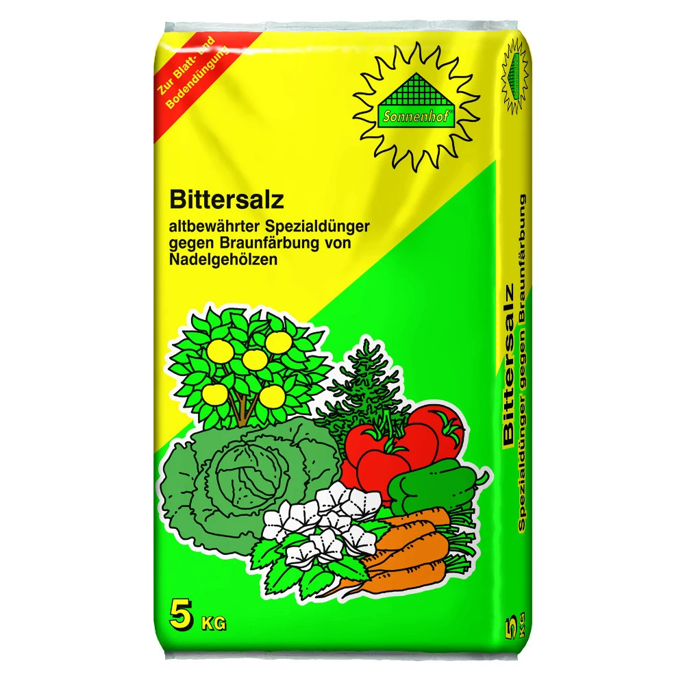 Das Bittersalz von Sonnenhof dient zur Blatt- und BodendĂŒngung und hilft gegen die BraunfĂ€rbung von Nadelgehölzen. Durch die Wasserlöslichkeit kann man Sonnenhof Bittersalz sowohl streuen als auch gieĂen und spritzen.
